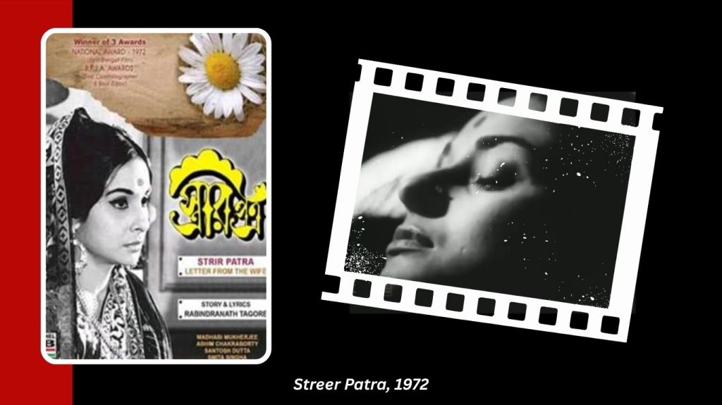 Tagore’s path-breaking short story was heavily criticized when it first came out in 1913, for its harsh denouncement of the male-dominated society of the era. Written in the form of a letter that a wife pens to her husband – beginning with the commonly used word honorific ‘Sricharankamaleshu’(at your lotus-like feet) and ending with the ironic ‘Charanatalashraychhinna’ (separated from your lotus-like feet), signifying her rejection of everything she is expected to do for the sake of her relationships – Tagore’s revolutionary and forward-looking text gets the class treatment in Purnendu Pattrea’s adaptation. The works of this poet, writer, illustrator and artist have never received the attention they deserve, maybe because his filmography is limited to only a handful of films, three of which star Madhabi. And in the actor, who made the perfect Charu eight years earlier, Purnendu Pattrea has just the right Mrinal.