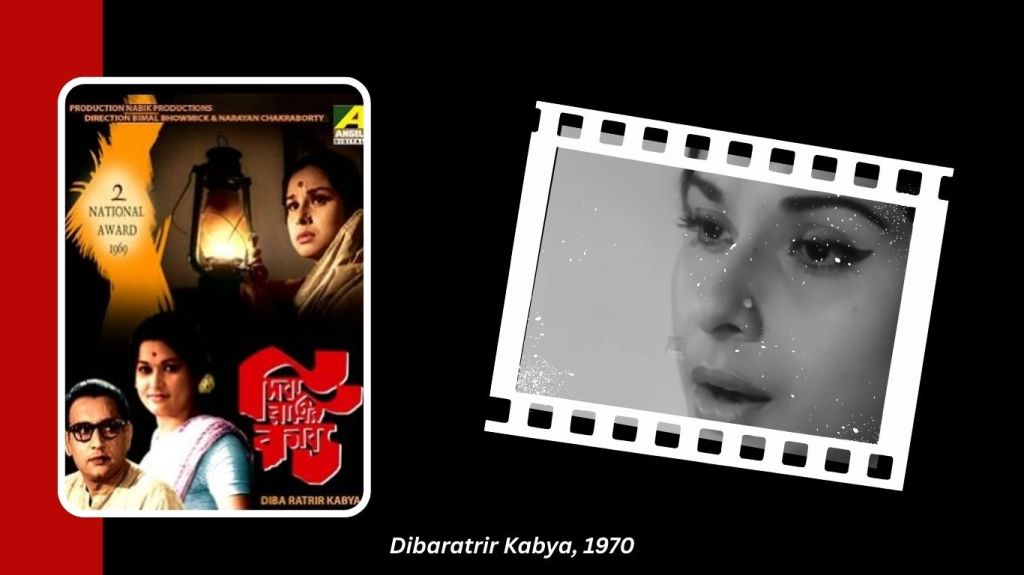 Though the comments by Andrew Robinson and Chidananda Dasgupta on her interiority that I began the essay with all pertain to Madhabi Mukherjee’s more celebrated acts in the Ray films, the ‘flutter of a searching mind’, the ‘enticing mystery of woman’ that comes through strongly in the performance that fetched the actress her only National Award, in a film that has received scant mention despite its many merits: Dibaratrir Kabya. The two mentions I have seen online refer to her character, Supriya, as one who ‘not only ruins her life but everybody else’s around her’, which is like dismissing Emma Bovary as a dreamy romantic.